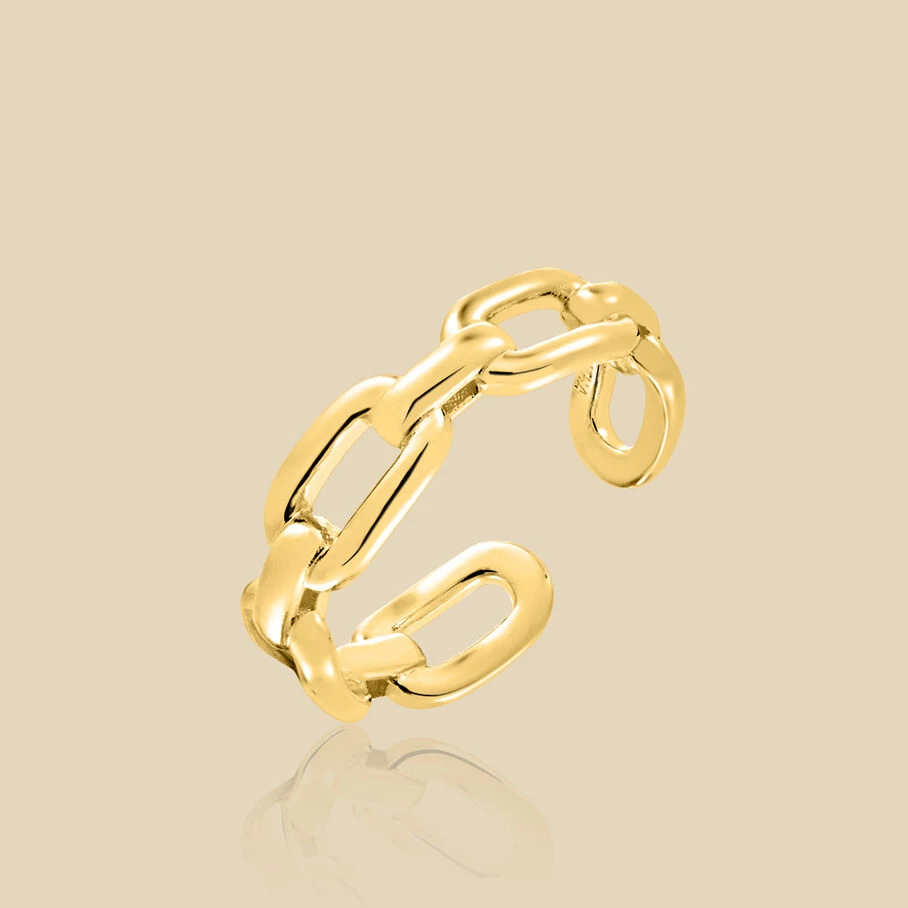 Bague ouverte en laiton plaqué or formée d’une maille rectangulaire rigide. PM: 48/50 – MM: 52/54 – GM: 56/58
