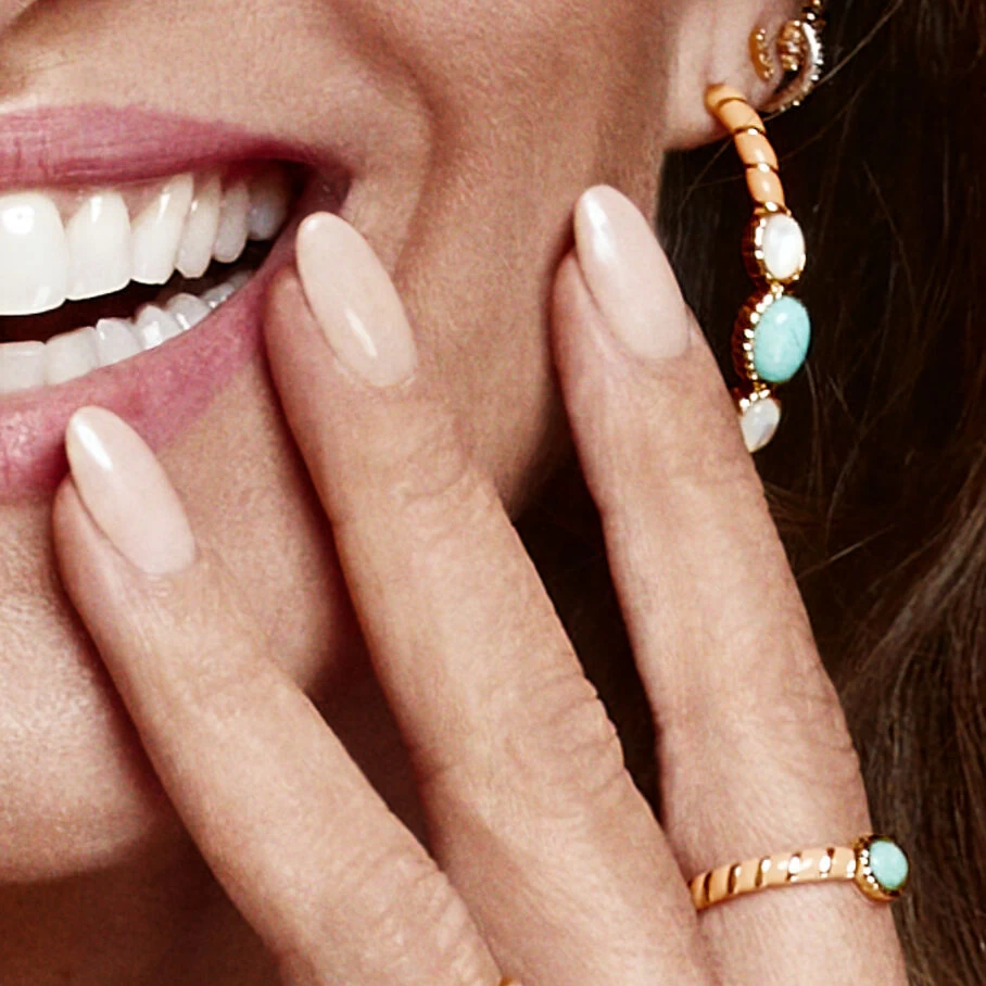 Bague fine, en laiton doré 750/1000, à la fois tressée et émaillée avec une pierre naturelle au centre.