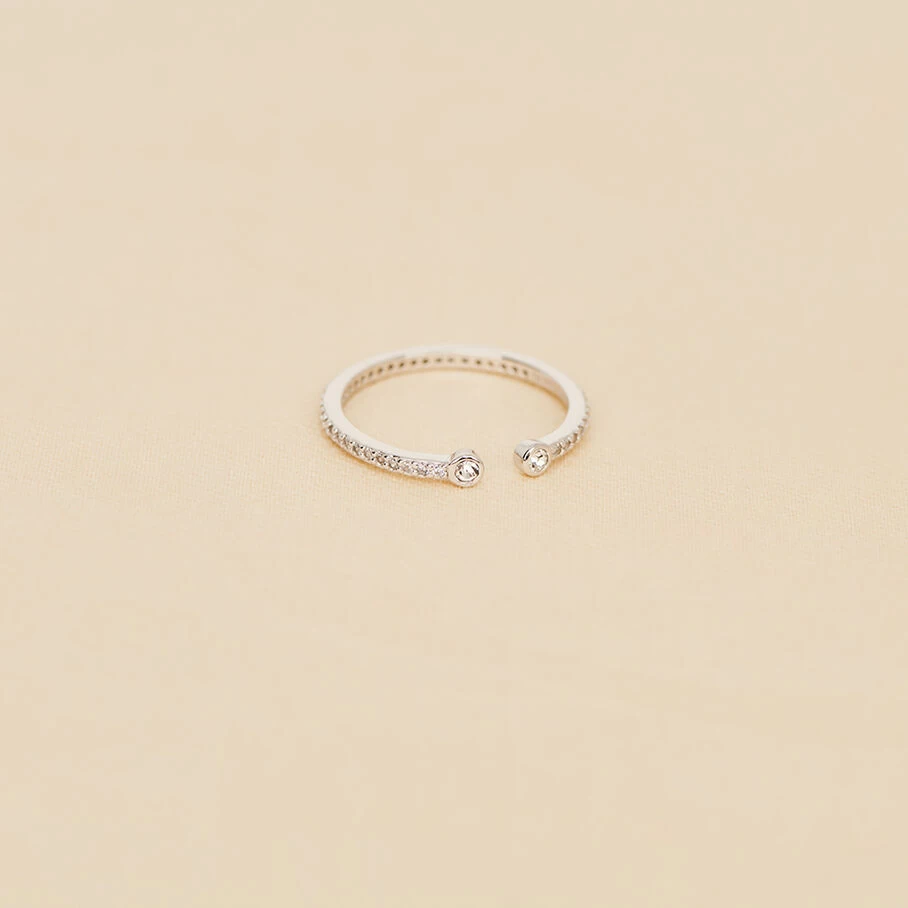 Bague fine ouverte en argent véritable pavée d’oxydes de zirconium et et ornée de deux oxydes sertis aux extrémités