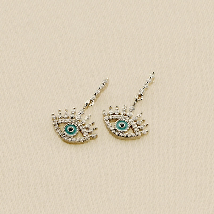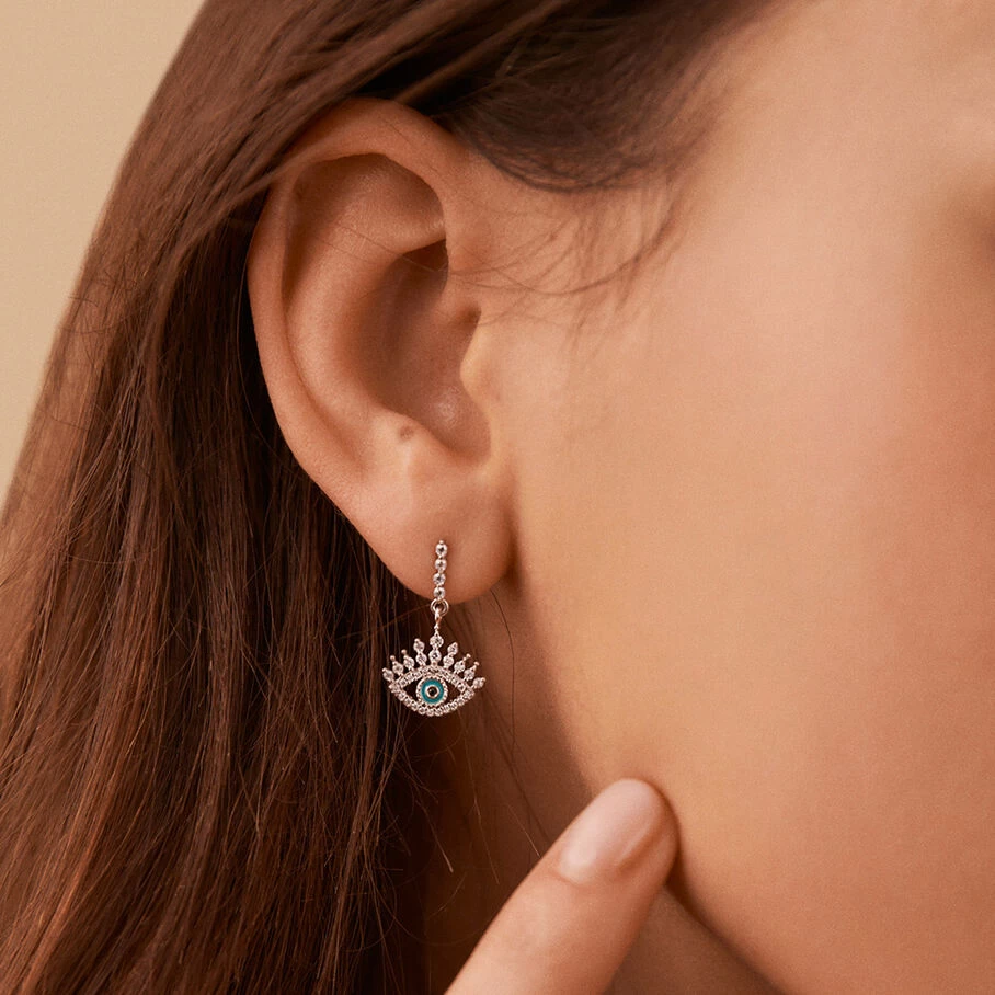 Boucles d’oreilles mi-longues, en argent véritable 925/1000 et dorées 750/1000, dont le pendentif est un œil turc. L’iris émaillé et le contour de l’œil serti d’oxydes de zirconium apportent un vrai raffinement et éclat au produit!