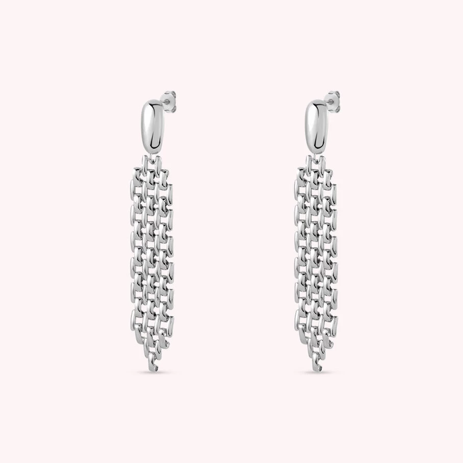 Boucles d’oreilles longues, en laiton et étain, dont la maille ressemble à une maille de montre