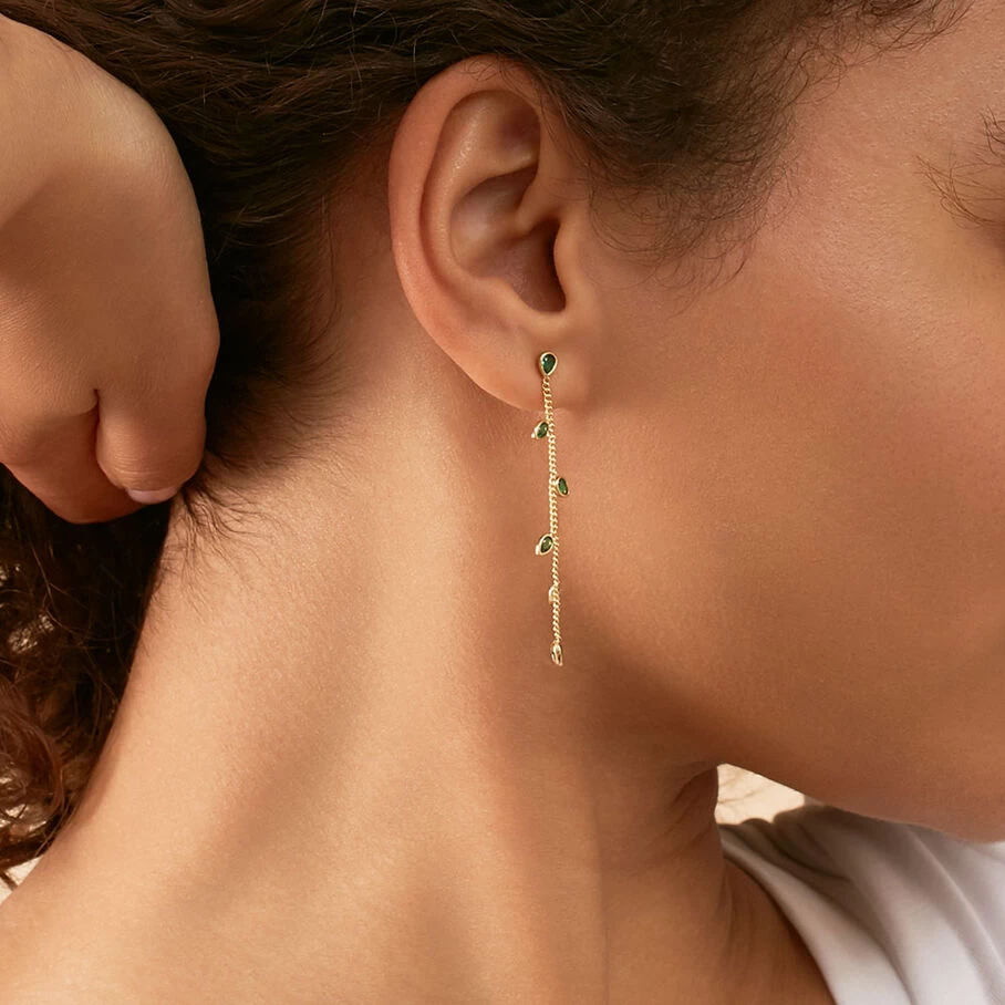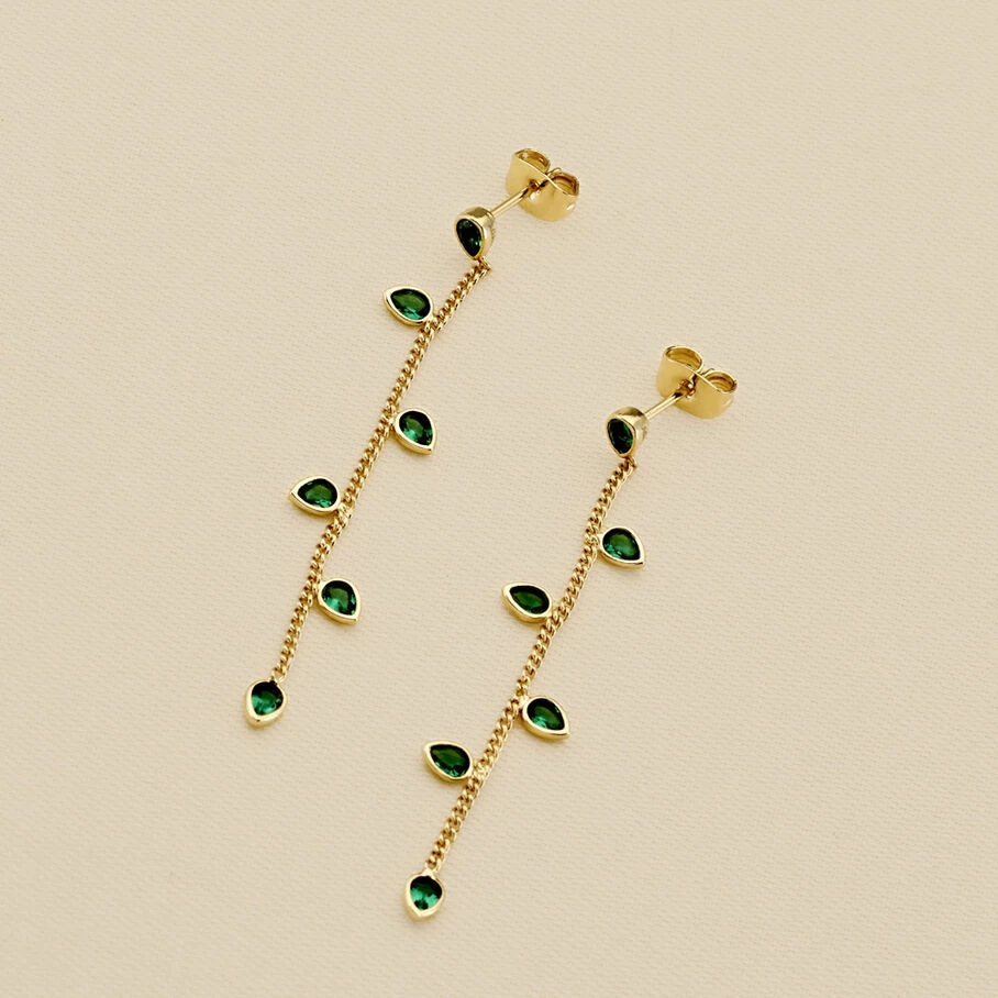 Boucles d’oreilles linéaires, en laiton doré 750/1000, sur laquelle sont suspendus des oxydes de zirconium, en forme de goutte