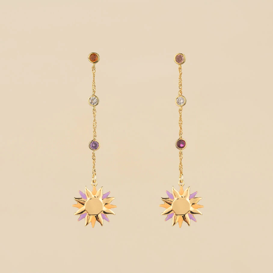 Boucles d’oreilles mi-longues, en laiton doré 750/1000, oxydes de zirconium setis clos sur chaine et soleil émaillé au bout