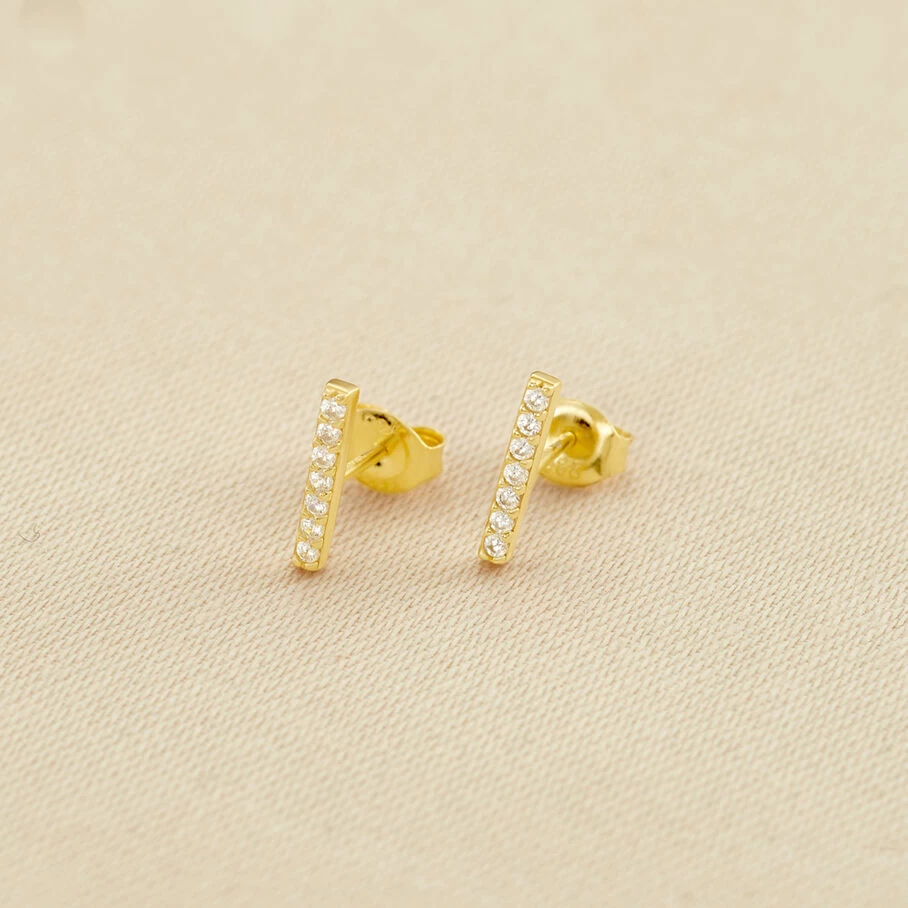 Boucles d’oreilles puces en argent véritable et dorées 750/1000, formées de petites barres pavées d’oxydes de zirconium