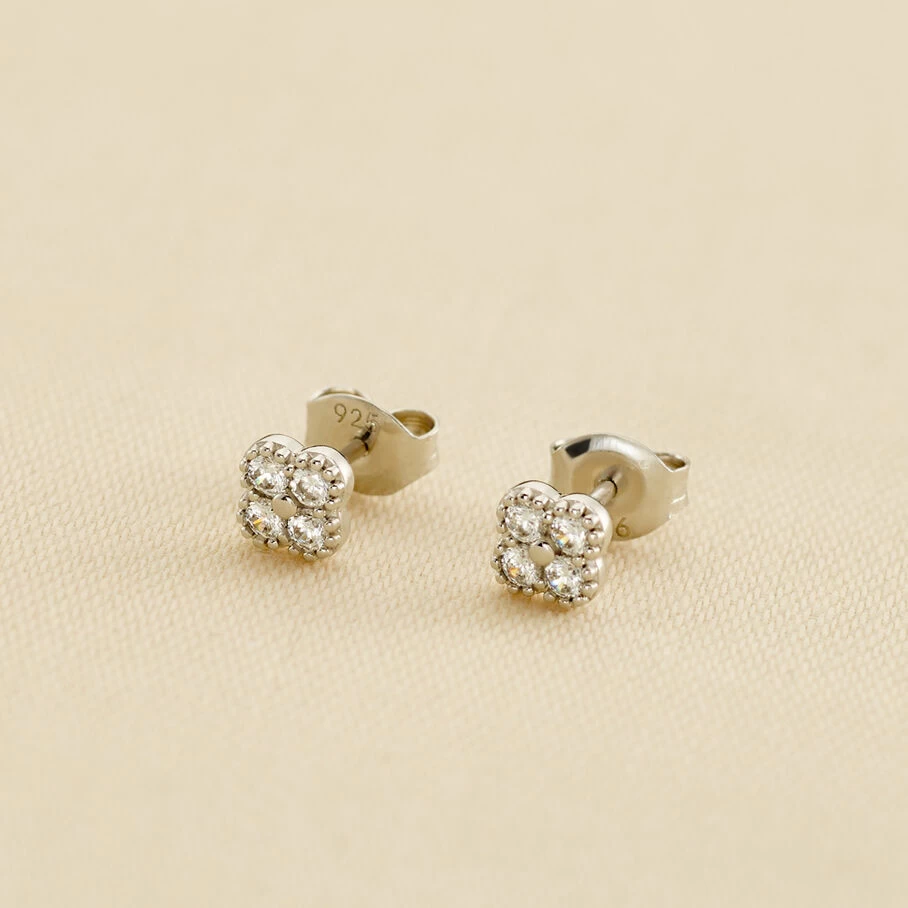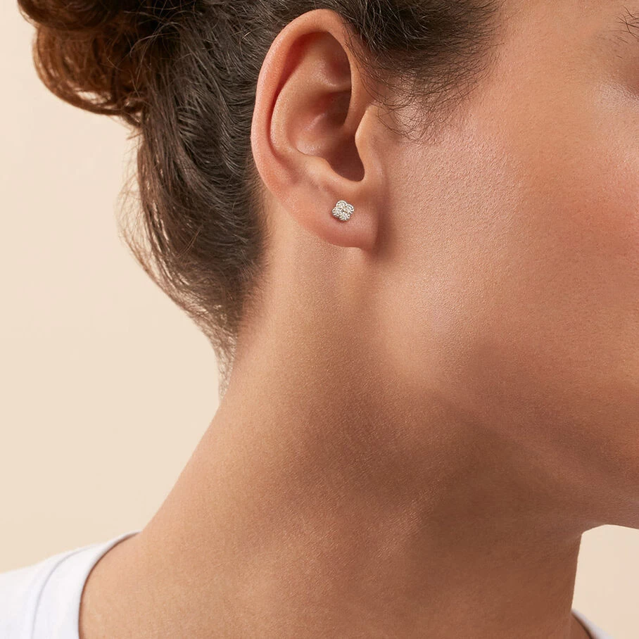 Boucles d’oreilles puces, en argent véritable, en forme de fleur dont les pétales sont pavés d’oxyde de zirconium et le pourtour réalisé avec un fin graineti