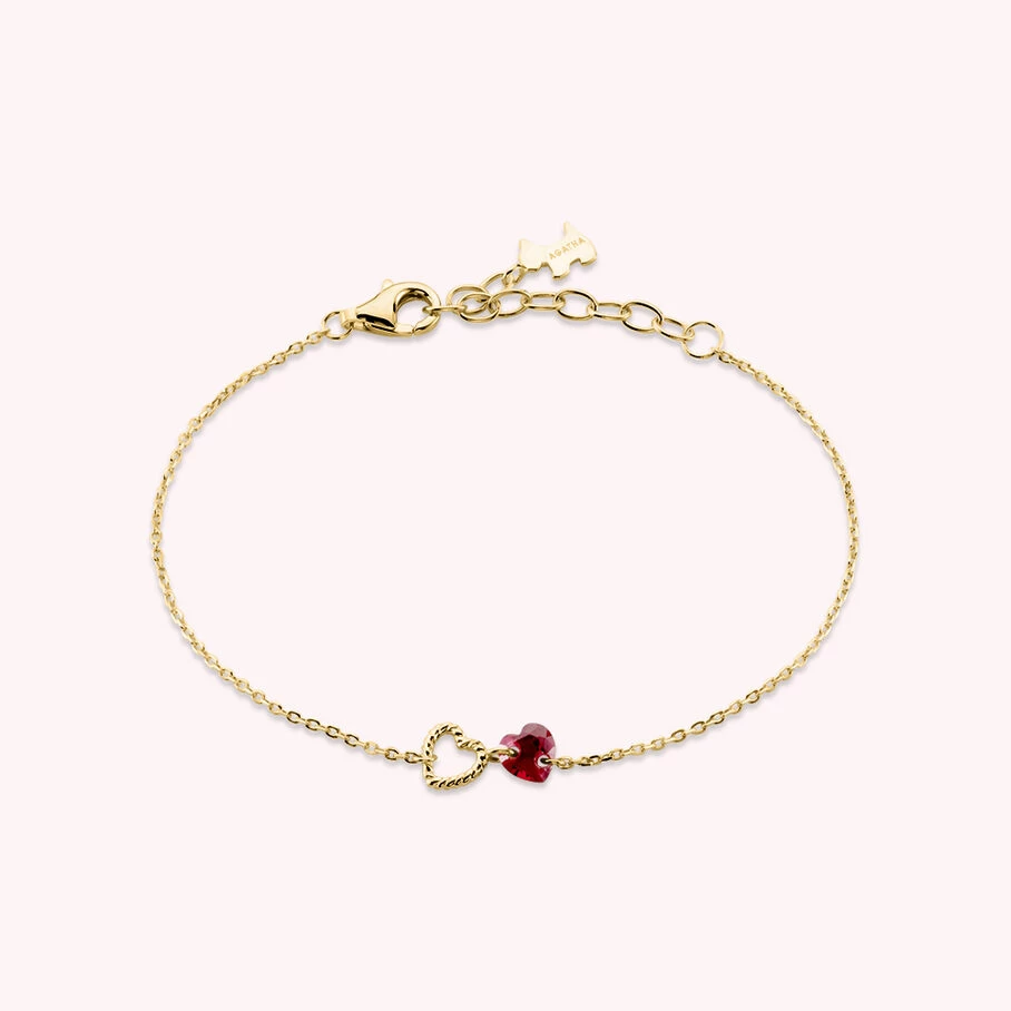 Bracelet, en argent véritable doré 750/1000, avec deux cœurs jumelés, l’un est en fil torsadé et l’autre est un oxyde de zirconium perçé