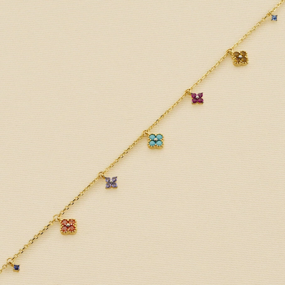 Bracelet chaine, en argent véritable doré 750/1000, avec des fleurs d’oxydes de zirconium en pampille et un fin graineti sur le pourtour