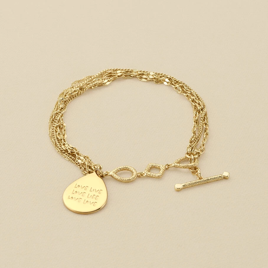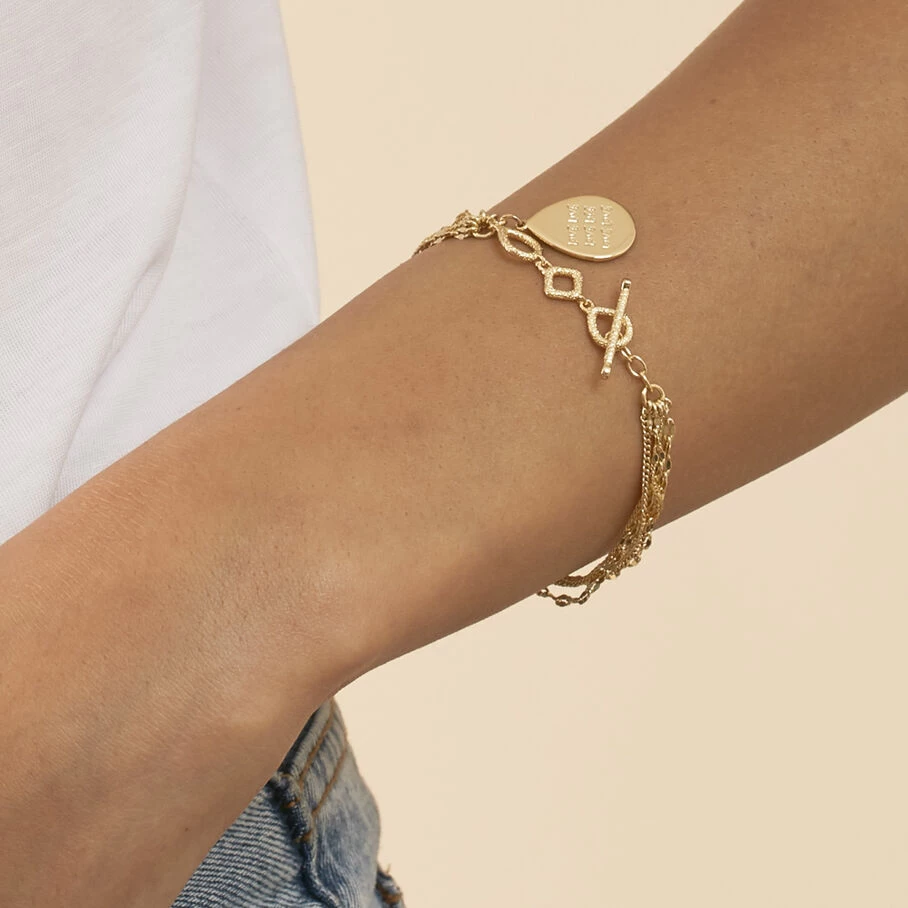 Bracelet, en laiton doré 750/1000, composé de 5 chaines fines. On signe ce bracelet avec un fermoir barrette, si identitaire à la marque et une médaille, en pampille, sur laquelle est gravé une citation positive sur la vie