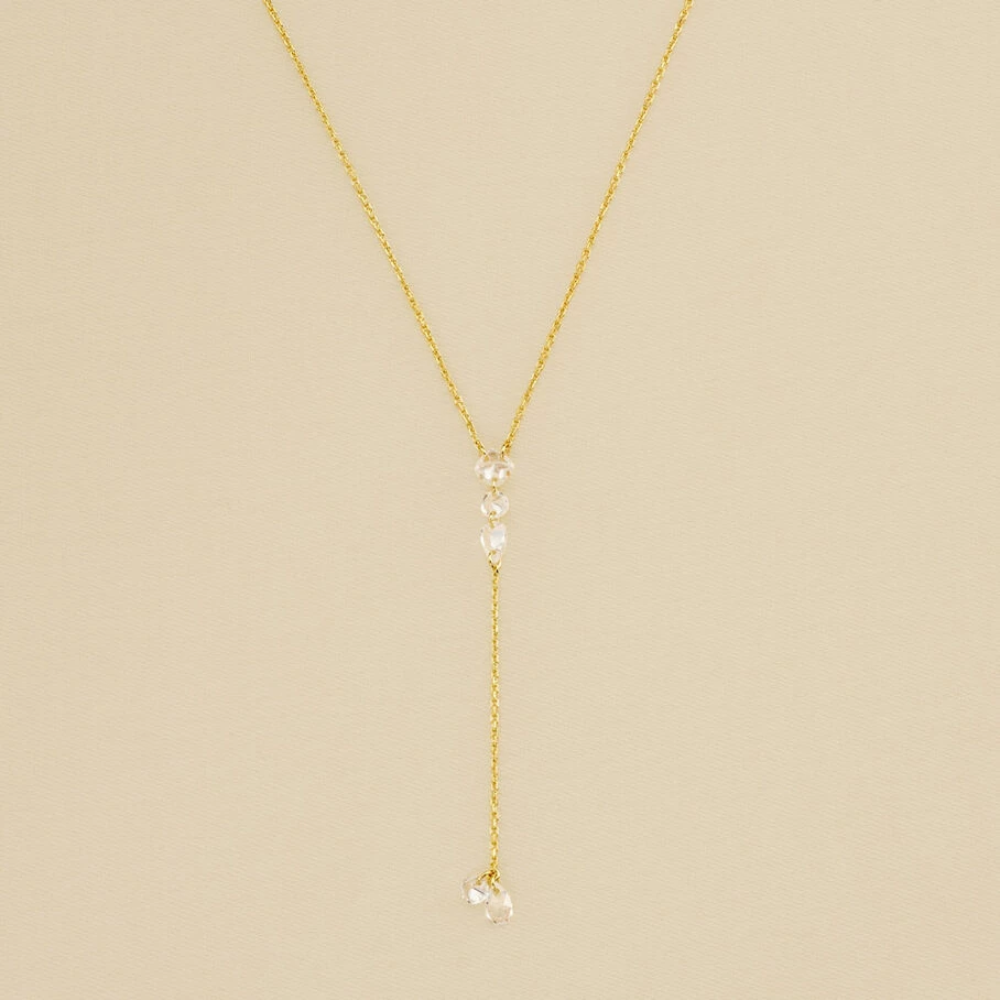 Collier Y, en argent véritable doré 750/1000, avec une trilogie d’oxydes de zirconium percés en forme de poire, rond et coussin, oxydes de zirconium, en pampilles