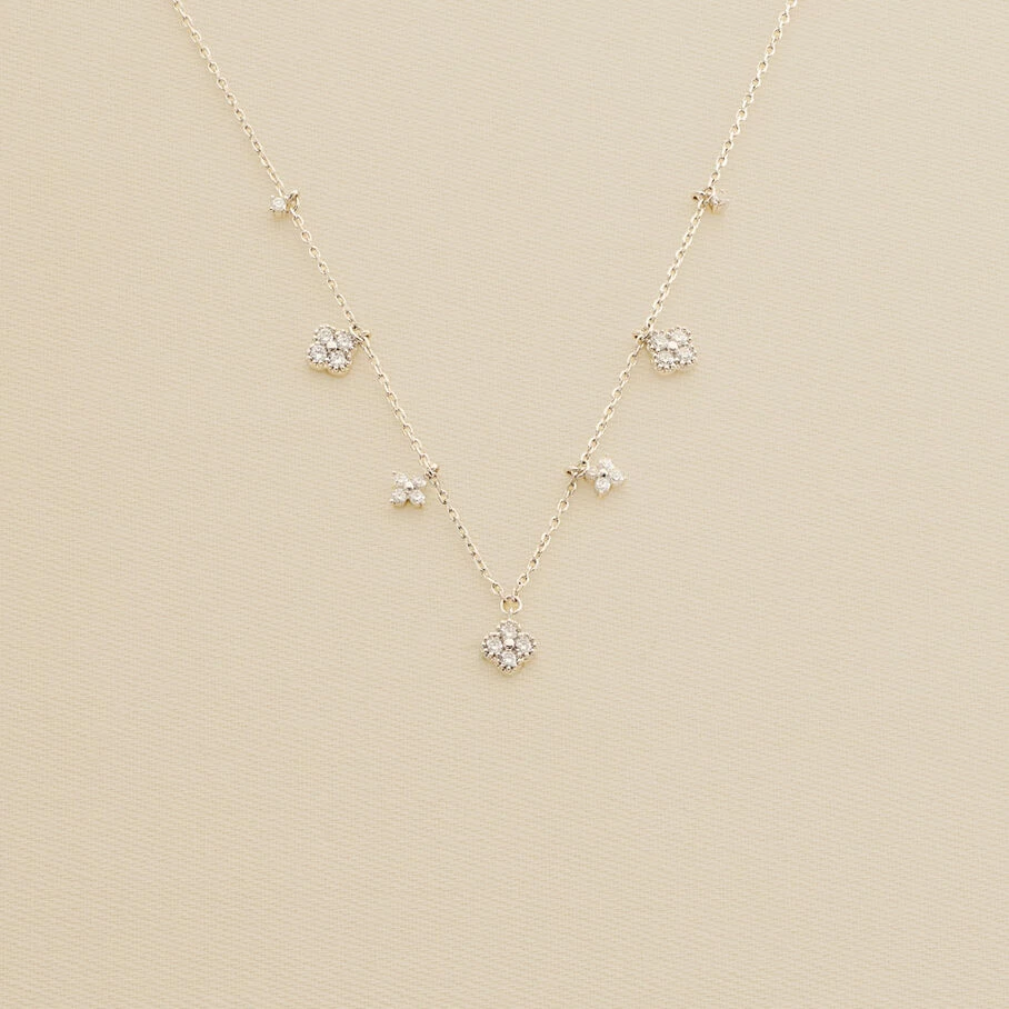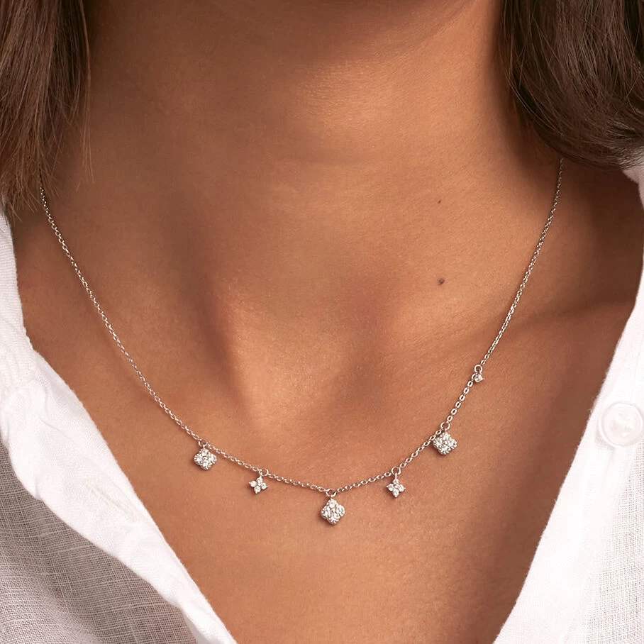 Collier court, en argent véritable, avec des fleurs d’oxydes de zirconium en pampille et un fin graineti sur le pourtour