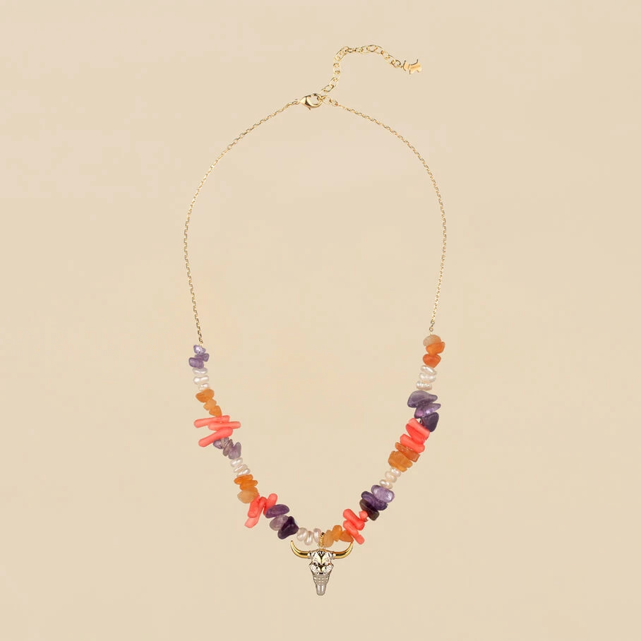 Collier court, en laiton doré 750/1000, section de pierres fines et tête de buffle en pendentif