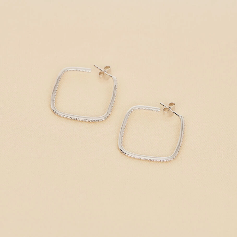 Créoles portées de face, carrés ajourés et pavés d’oxydes de zirconium, en argent véritable.