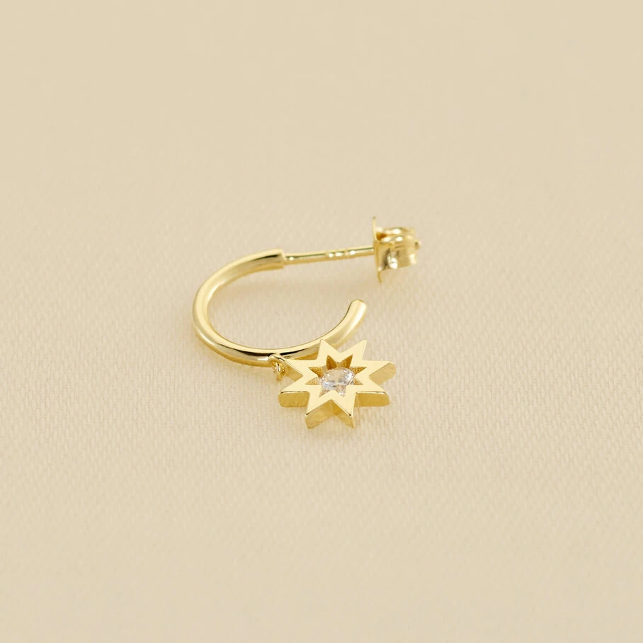 Créole, en argent doré 750/1000, grande étoile avec un oxyde de zirconium au centre. A l’unité pour mieux les mixer et les accumuler.