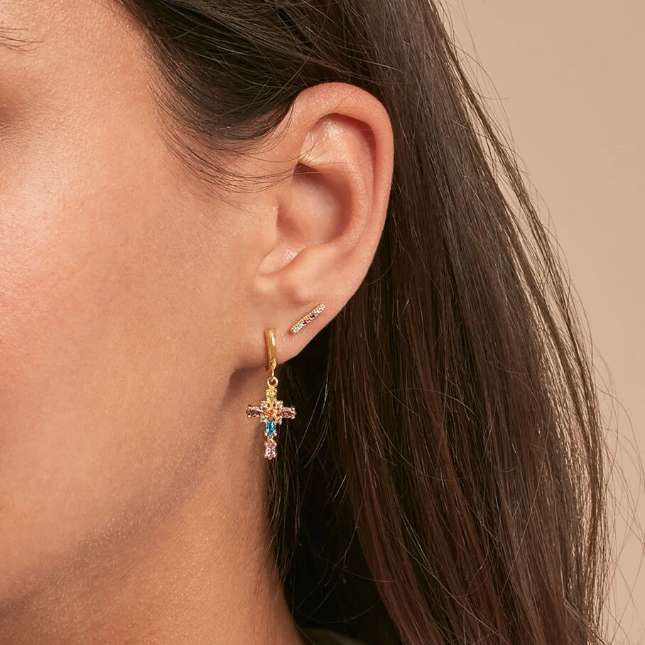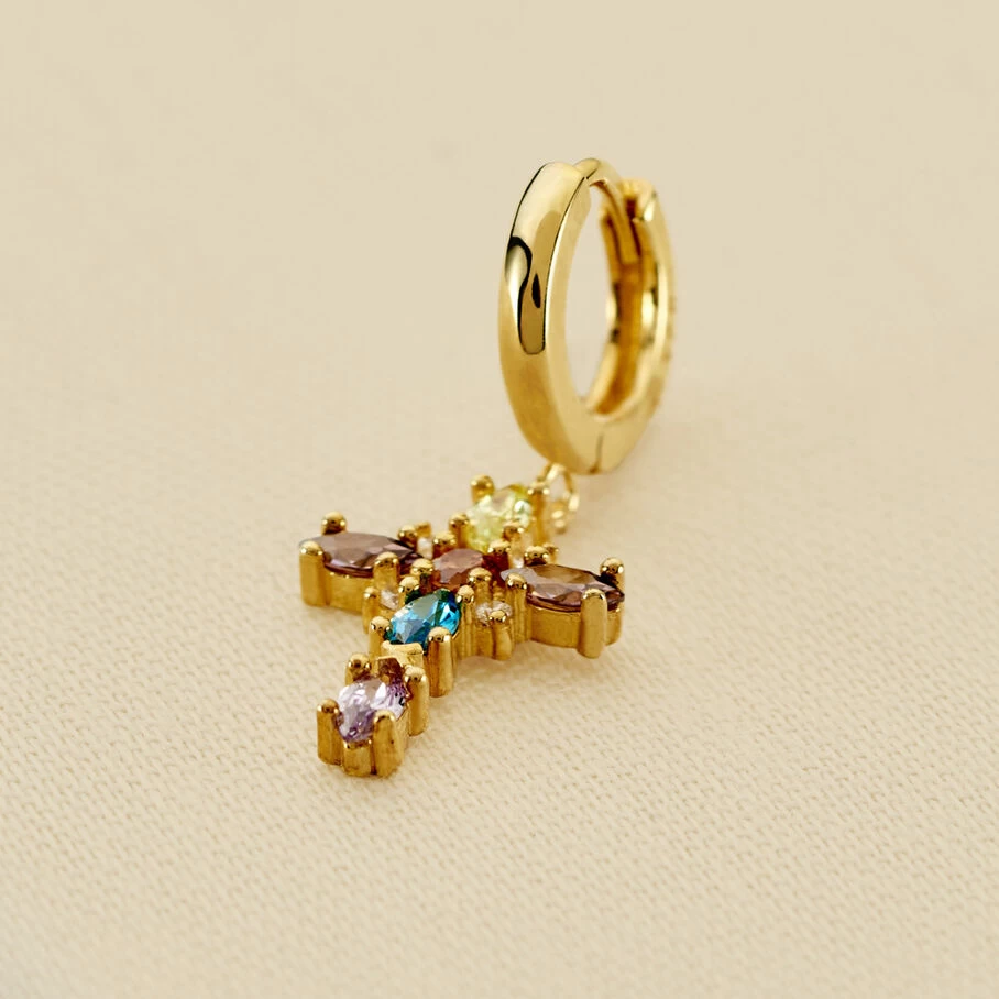 Mini créole en argent doré 750/1000 ornée d’une grande croix pavée d’oxydes de zirconium en pampille. A l’unité, pour mieux les mixer et les accumuler.