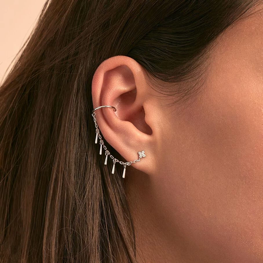 Earcuff, en argent 925, fleur pavée d’oxydes de zirconium reliée à un faux piercing anneau par une chaine ayant des gouttes en pampilles. A l’unité.