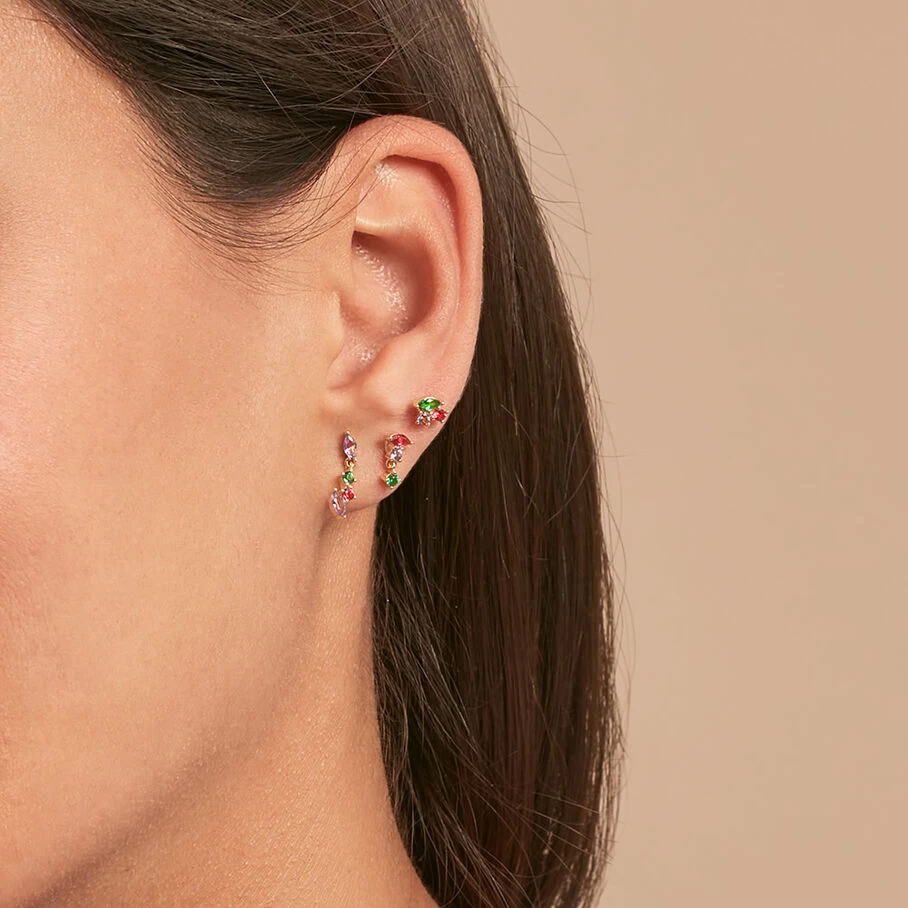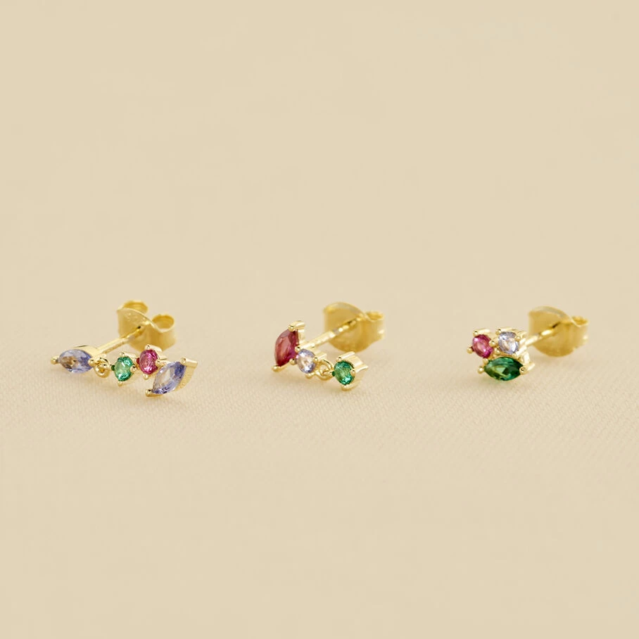 Set de 3 boucles d’oreilles, en argent doré 750/1000, amas d’oxydes de zirconium de différentes formes