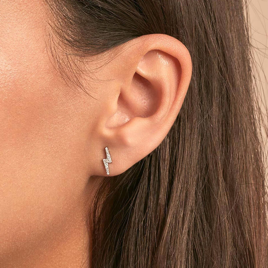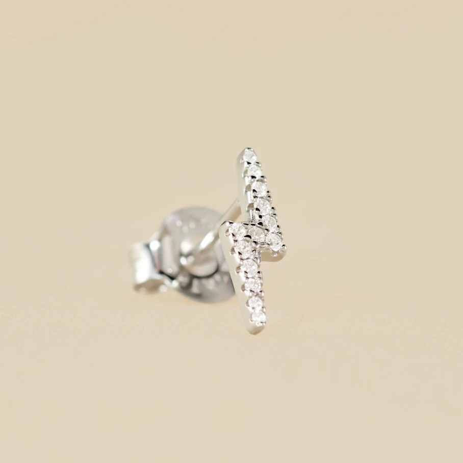 Boucle d’oreille puce en argent véritable en forme d’éclair pavé d’oxydes de zirconium. A l’unité, pour mieux les mixer et les accumuler.