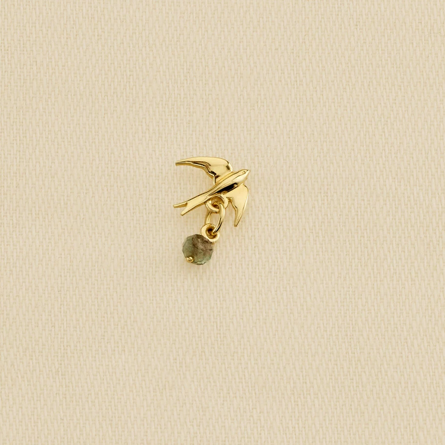 Boucle d’oreille puce à l’unité, en argent 925/1000 et dorée 750/1000, représentant une hirondelle. En dessous vous observerez une pampille de deux perles de pières naturelles.