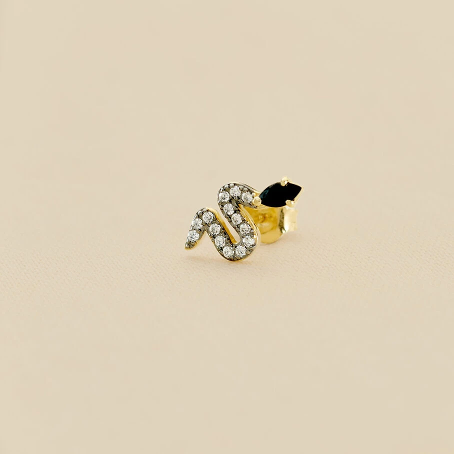 Boucle d’oreille puce en argent véritable doré à l’or fin en forme de serpent pavé d’oxydes de zirconium. A l’unité, pour mieux les mixer et les accumuler.