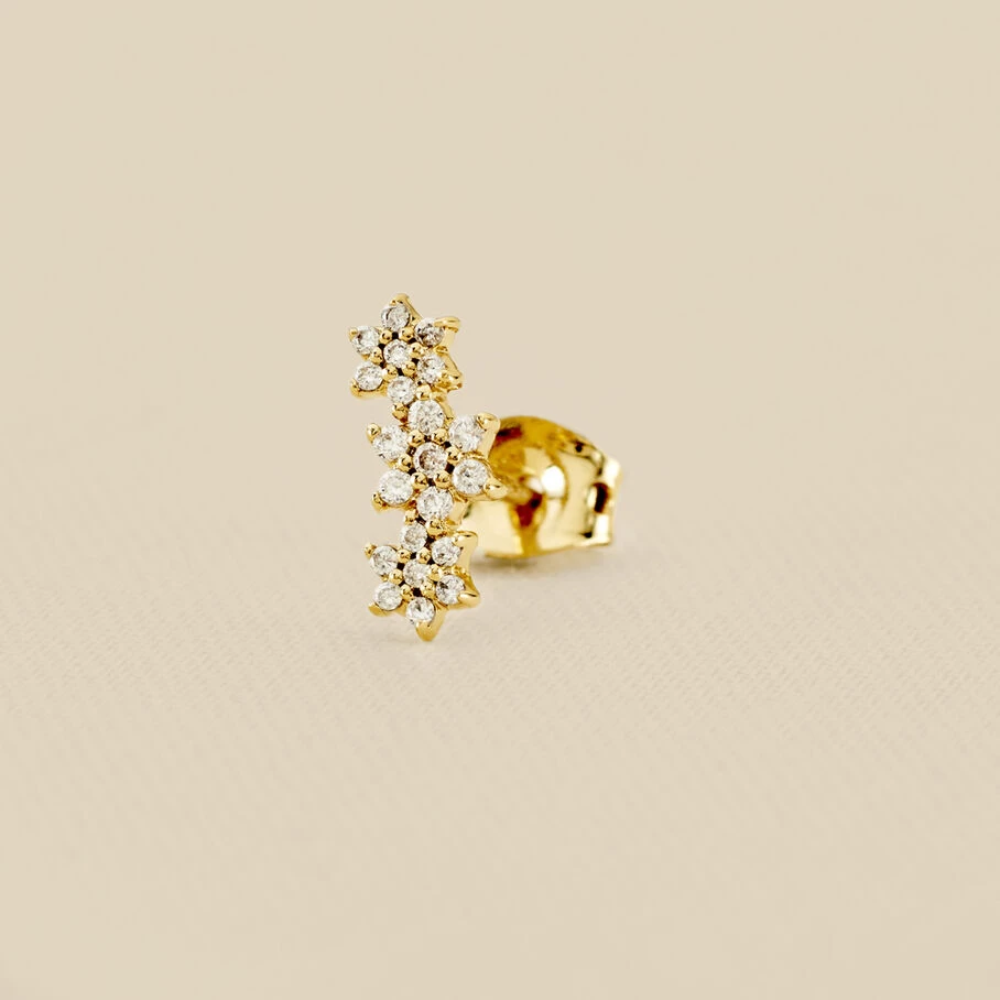 Boucle d’oreille puce argent doré 750/1000 en forme de trois fleurs pavées d’oxydes de zirconium. A l’unité, pour mieux les mixer et les accumuler.