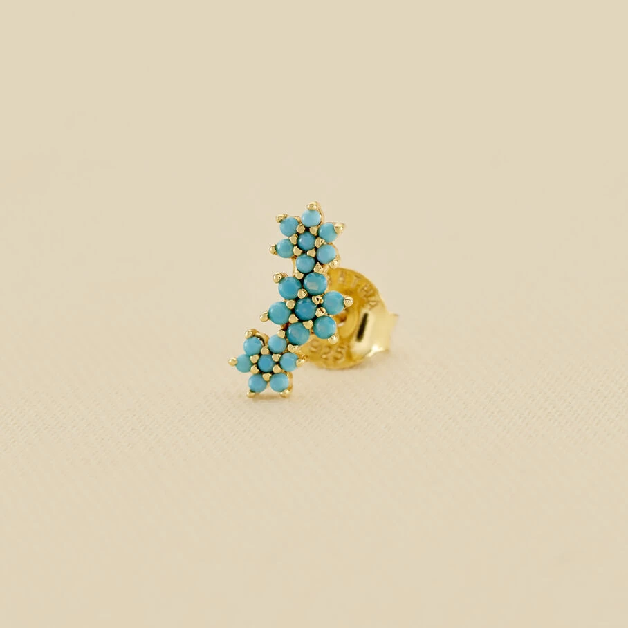 Boucle d’oreille puce argent doré 750/1000 en forme de trois fleurs pavées d’oxydes de zirconium. A l’unité, pour mieux les mixer et les accumuler.