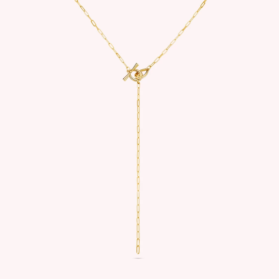 Collier Y, en argent véritable doré à l’or fin, fait de maille dont le fermoir représente deux gouttes entrelacées et serties d’oxydes de zirconium sur la tranche extérieure