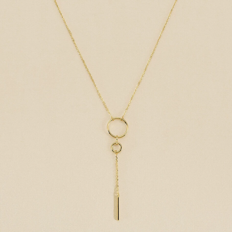 Collier Y, en argent véritable doré 750/1000, avec une fine chaîne sur laquelle sont montés deux anneaux évidés de différentes tailles
